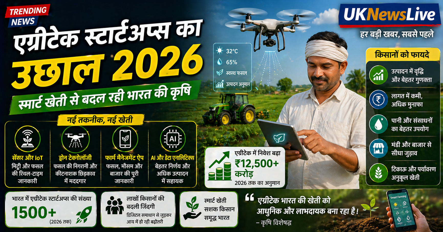एग्रीटेक स्टार्टअप्स : भारत में एग्रीटेक स्टार्टअप्स 2026 में तेजी से उभर रहे हैं। स्मार्ट खेती, ड्रोन टेक्नोलॉजी और डिजिटल फार्मिंग के जरिए कृषि क्षेत्र में बड़ा बदलाव देखने को मिल रहा है।