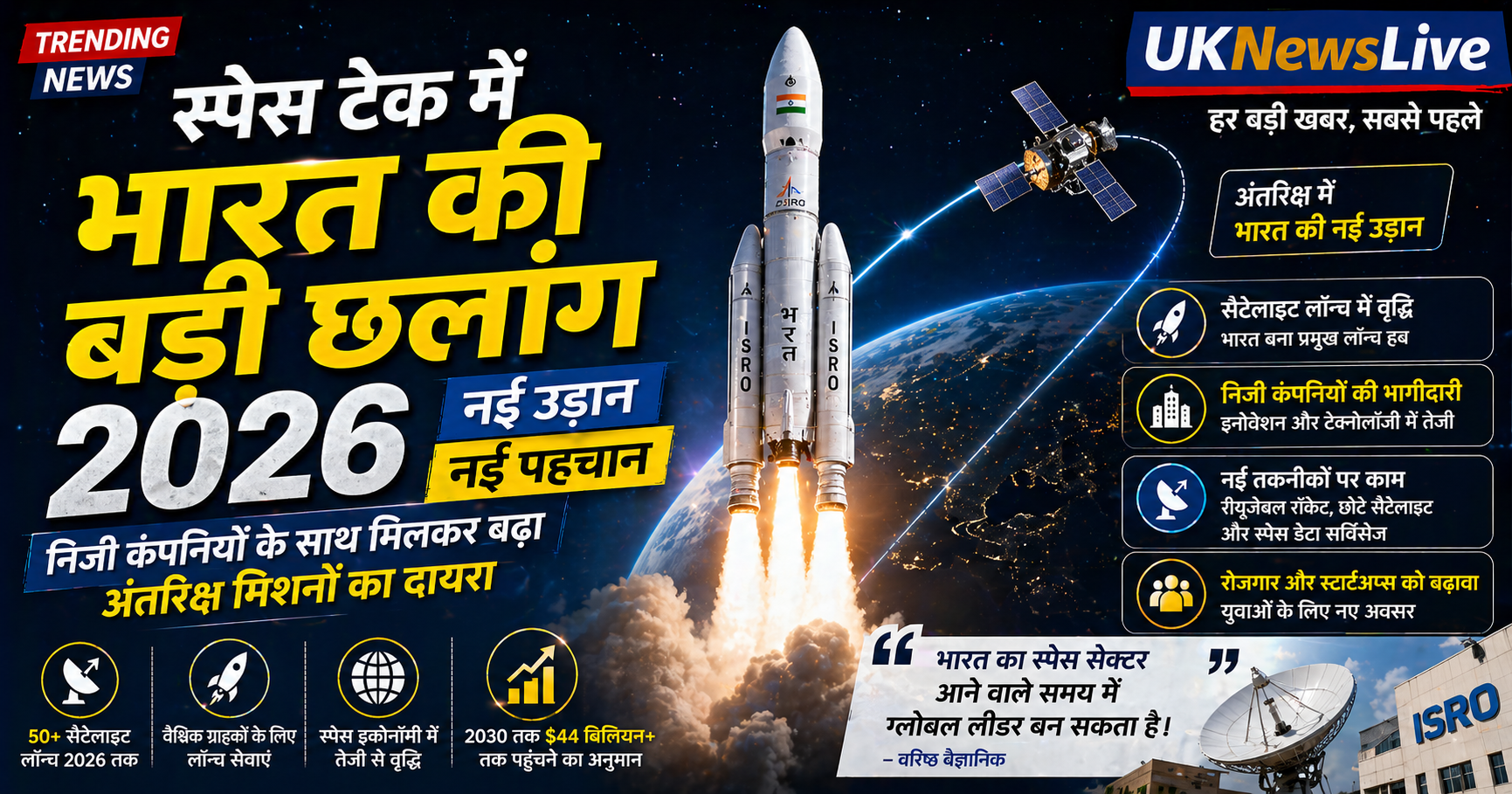 स्पेस टेक में भारत की बड़ी छलांग : भारत में स्पेस टेक सेक्टर 2026 में तेजी से उभर रहा है। सरकारी एजेंसियों और निजी कंपनियों के सहयोग से अंतरिक्ष मिशनों का दायरा बढ़ा है और देश नई उपलब्धियों की ओर बढ़ रहा है।