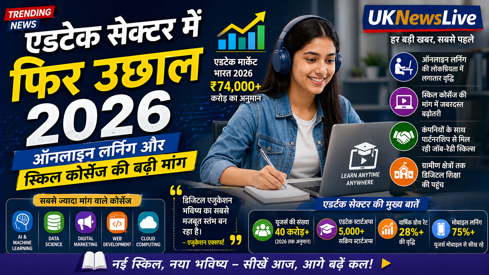 AI, डेटा साइंस, डिजिटल मार्केटिंग जैसे कोर्सेज की मांग तेजी से बढ़ रही है।