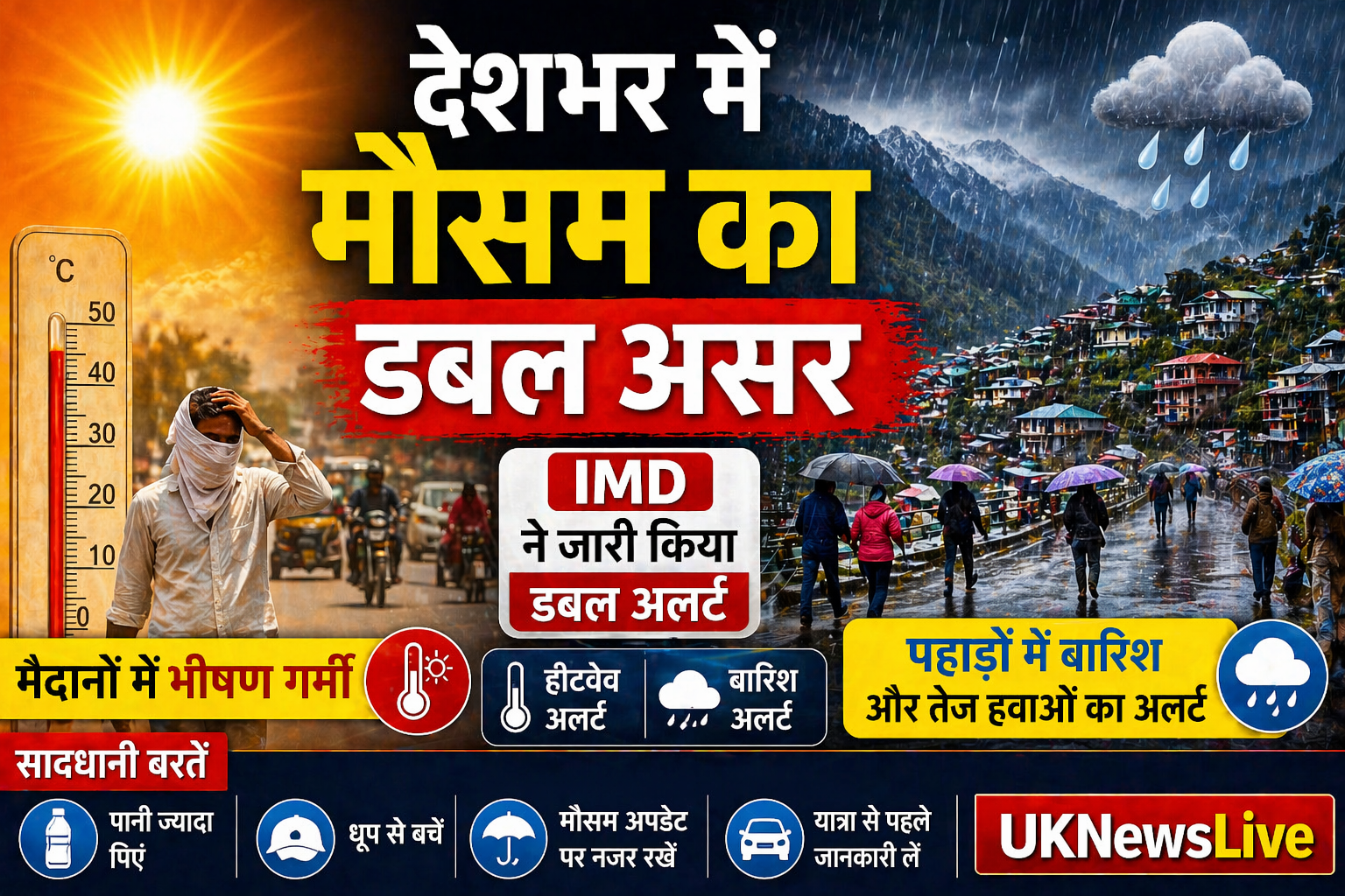 IMD मौसम अलर्ट : देशभर में मौसम ने दो अलग-अलग रूप दिखाने शुरू कर दिए हैं। जहां मैदानी इलाकों में भीषण गर्मी का कहर जारी है, वहीं पहाड़ी राज्यों में बारिश और तेज हवाओं का अलर्ट जारी किया गया है। भारत मौसम विज्ञान विभाग (IMD) ने इसे लेकर डबल अलर्ट जारी किया है और लोगों से सावधानी बरतने की अपील की है।